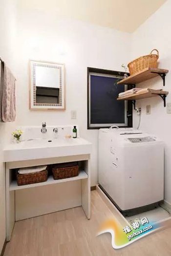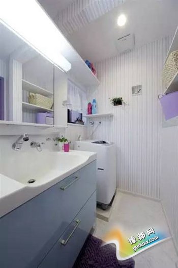 装饰Tips:看这一款摆放,洗衣机与洗漱台相同方向的摆放,中间一个小墙壁将洗漱台和洗衣机分开,明显的界限,不仅可以避免洗漱台侧的水溅到洗衣机上,而且大小正好的角落将洗衣机放在里面,利用了小的空间,大大增加了洗漱间的收纳性。