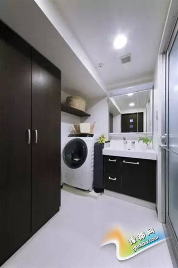 装饰Tips:对于长方形的洗漱间来说,我们应该将洗衣机放在哪里呢?洗漱台是依靠一侧墙壁摆放的,那么我们将洗衣机也放在洗漱台的一侧,靠近里面墙壁的位置,这样,将那洗衣机与洗漱台放在一侧,正好可以留出一条道,方便行走,而且放在最里面的固定的位置上,从外观色彩上来看,与洗漱台相同的白色,又令整个空间从色彩上达到了协调统一。