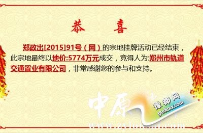 郑政出[2015]91号(网)地块位于建设西路北、洛达路西,使用权面积6250.4㎡,合9.375亩。用途为商服、城镇住宅用地,容积率大于1且小于3.5, 地块起始价5774万元,最终被郑州市轨道交通置业有限公司竞得。按最大容积率3.5计算,该地块起始楼面价2639.37元/㎡,每亩地价615.89万元。