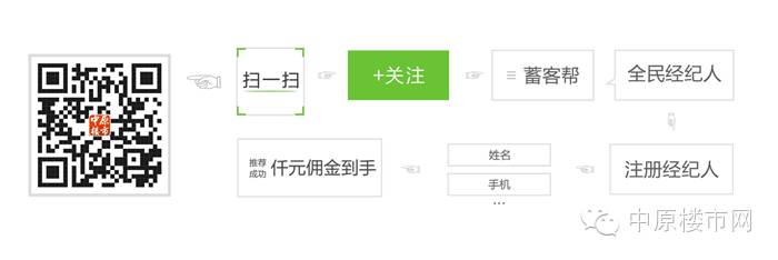 首先你要用手机关注“中原楼市网”官方微信,进入官微页面后,会看到屏幕右下角有一个“蓄客帮”,点击选择“全民经纪人”,收到入口消息后进入注册就哦了!简单易懂,推荐即可赚大钱!
