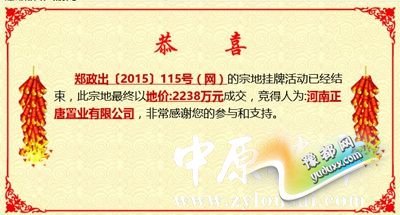 同一天,位于金水区的郑政出[2015]112,113,114均为城中村改造用地进行了现场竞拍,1宗住宅及2宗商务金融用地,总起价8.56亿元。三块地均被河南锦家置业有限公司收入囊下。据了解,河南锦家置业有限公司,2013年06月12日成立,经营范围包括房地产开发与经营(限制类、禁止类的除外)(凭有效资质证经营)等。目前开发项目有锦艺金水湾,为锦艺子公司。